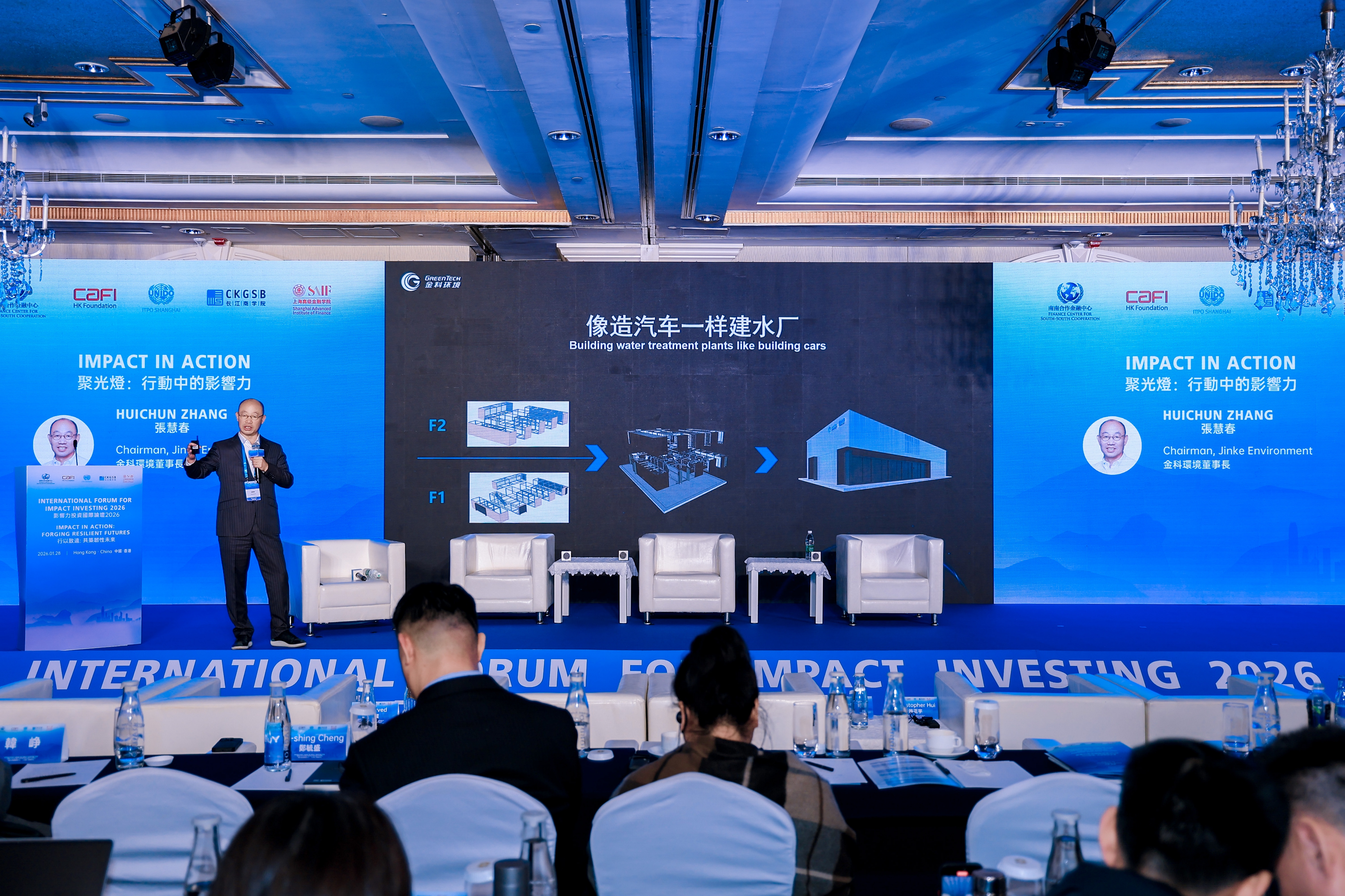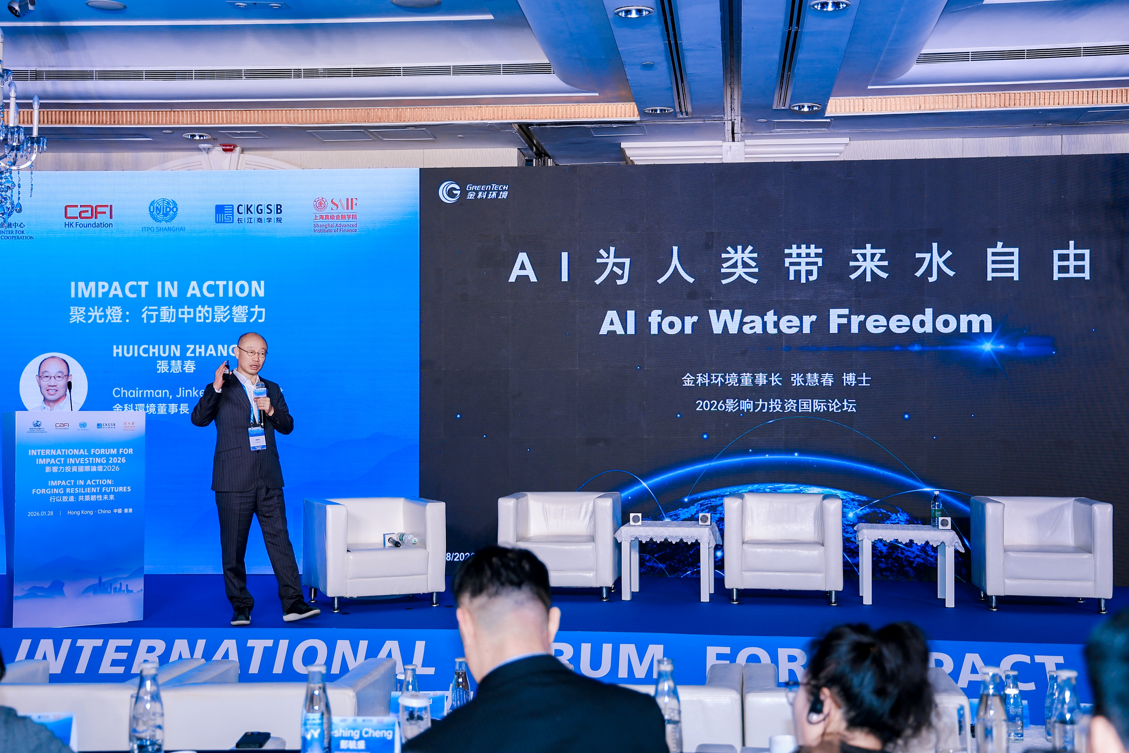 金科环境董事长张慧春受邀出席,在“聚光灯:行动中的影响力”环节发表主题演讲,以AI制水机器人新水岛®创造可持续的社会与环境效益,与现场嘉宾展开深入交流。他犀利指出:传统水厂70%左右的投资用于为人和与人相关的配套,不是直接用于水处理的设施或者设备,而金科环境打造的AI制水机器人新水岛®,通过“工程产品化+人工智能(AI)数智化”创新,彻底改变了这一模式——用AI取代人,实现无人值守;改变传统工程模式,像造汽车一样造水厂,带来工业化、标准化、规模化的产品,最终实现水厂的分布式应用和水资源的高效循环,带来占地面积节省90%,交付时间节省90%,运营人员节省90%,全生命周期节省50%的高效价值,实现人类用水自由。
