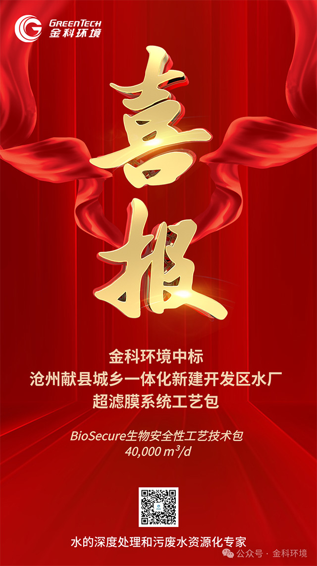 近日,献县城乡一体化新建开发区水厂及输水管道工程特许经营项目超滤膜系统工艺包采购中标结果公示,金科环境凭借专业的高品质水处理技术实力和丰富的行业经验中标,处理规模40,000m³/d,处理工艺:BioSecure生物安全性工艺技术包,项目建成后,将全面实现供水水质提升目标。